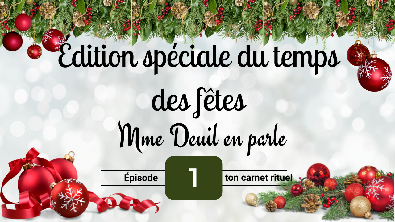 Je t’invite à écouter en rafale ou un épisode selon l’horaire qui te conviendra le mieux ce que j’ai concocté pour toi en ce mois de décembre. Je t’accompagne via mon balado (podcast) Mme Deuil en parle dans une série spéciale Noël et Temps des Fêtes où chaque épisode t’offre une pièce de ton Kit de Survie du temps des Fêtes que tu peux compléter dans ton carnet d’accompagnement à télécharger ici